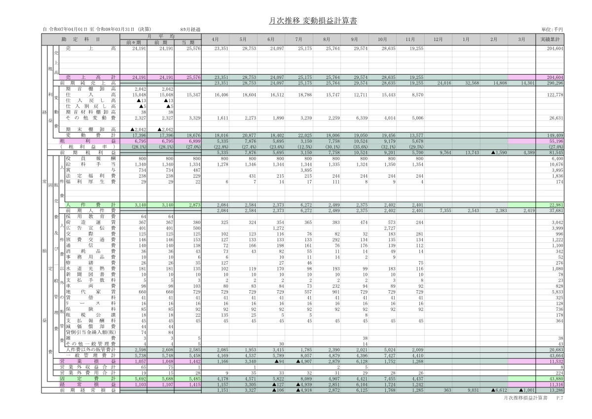 • 月次変動損益計算書
